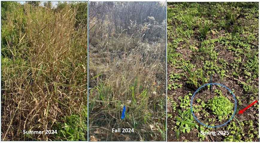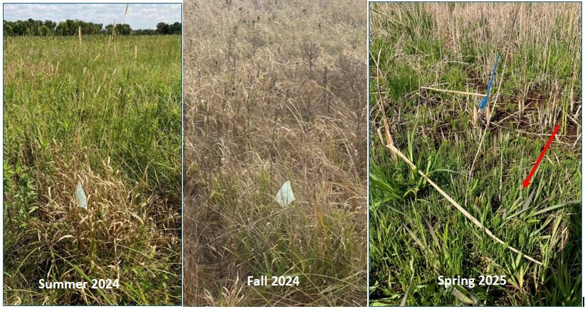 After tracking the spring 2024 clethodim treatments to reed canary grass, it seems that the two best windows for effective treatments are: 1) in the spring after a prescribed burn when the reed canary grass is short, and 2) during the fall (late October – November) when the reed canary grass is green but other vegetation has started to senesce. Treatments during the late spring or early summer are useful to target smaller, scattered reed canary grass that are difficult to find until they send up their flowering stalks. Using a combination of fall treatments (for effectiveness) followed by spring treatments (for visibility of missed or young individuals) may be the best option for reducing reed canary grass and allowing the native matrix to recover.