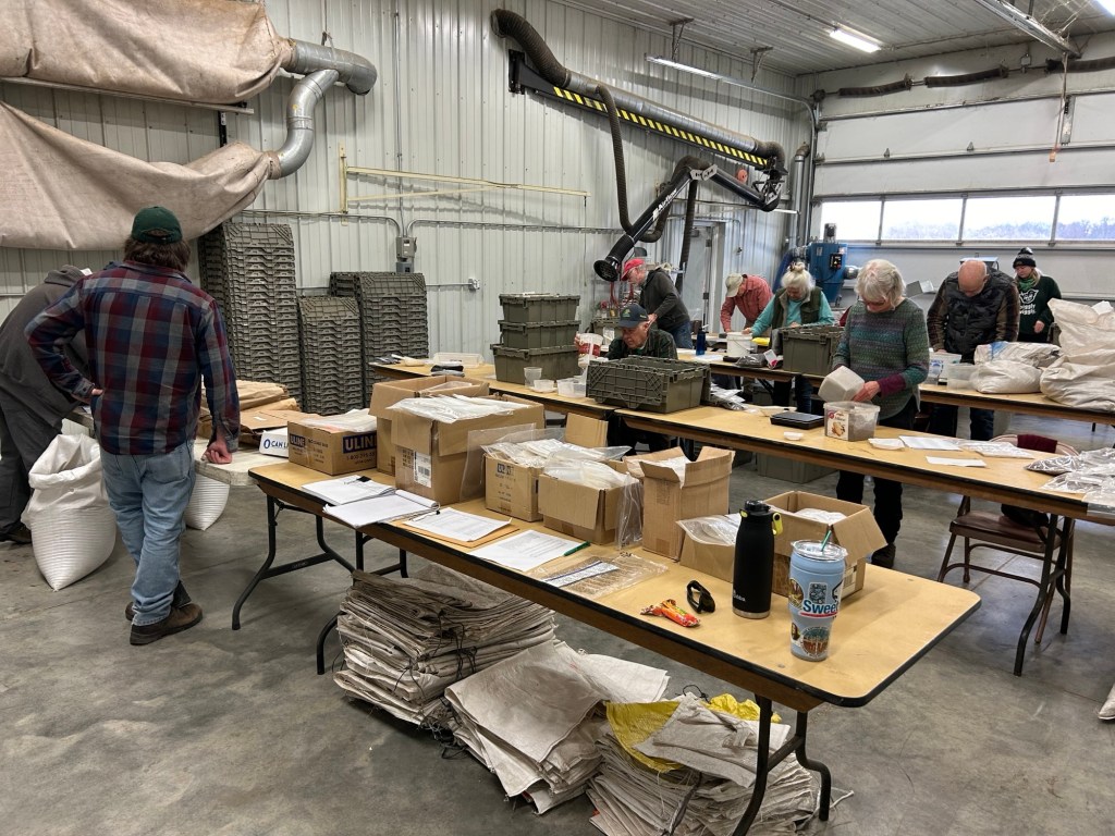 Weighing and bagging -Once all the seed has been cleaned, our staff weighs the totals of each species so we know what we have to work with for our seed mixes. This year we had 78 mixes, each for a different site to plant or over-seed. Dane County Parks volunteers, partner organizations, and local community groups (such as libraries and schools) request seed mixes from staff throughout the year that get on this list. Our seed is spread across the community, not just on Dane County land. The seed mixes are built in a spread sheet, and then it’s time to make them a reality by weighing out the correct amount of each species for each mix. Once again, our volunteers step up. This past year we had several seed weighing and bagging workdays in the first two weeks of the new year. Each volunteer works on one species at a time weighing out pre-determined amounts of seed, bagging them, and adding printed sticker labels with the correct mix. Staff then transport these bags into the next room and place them each in a designated mix area.