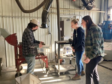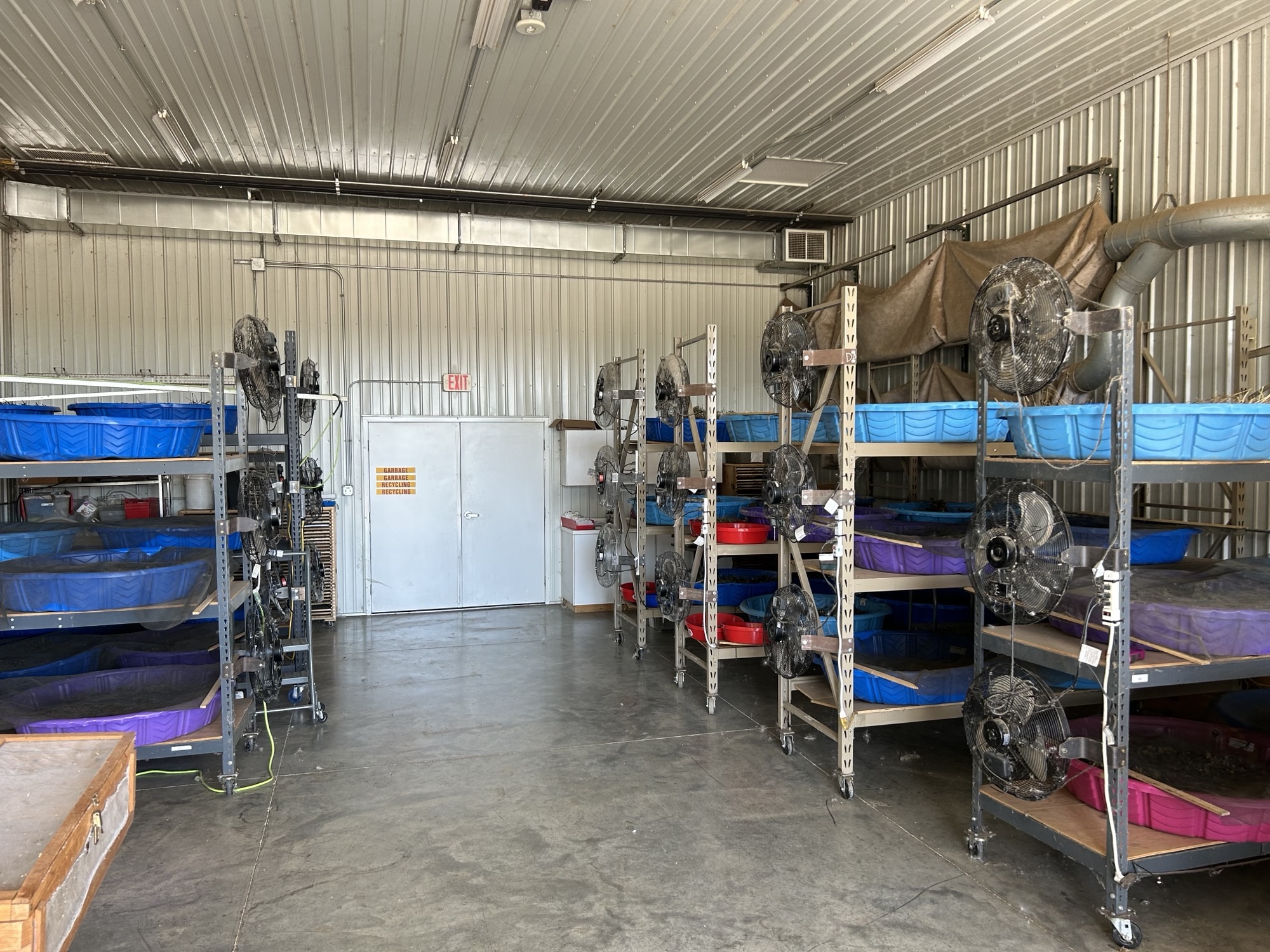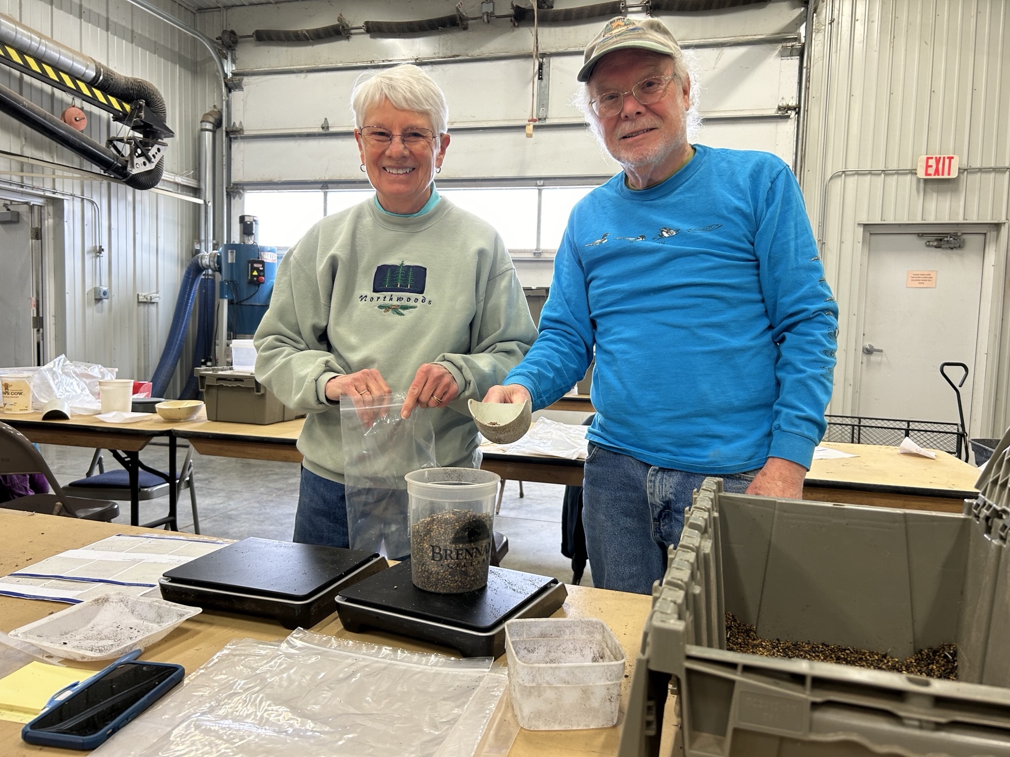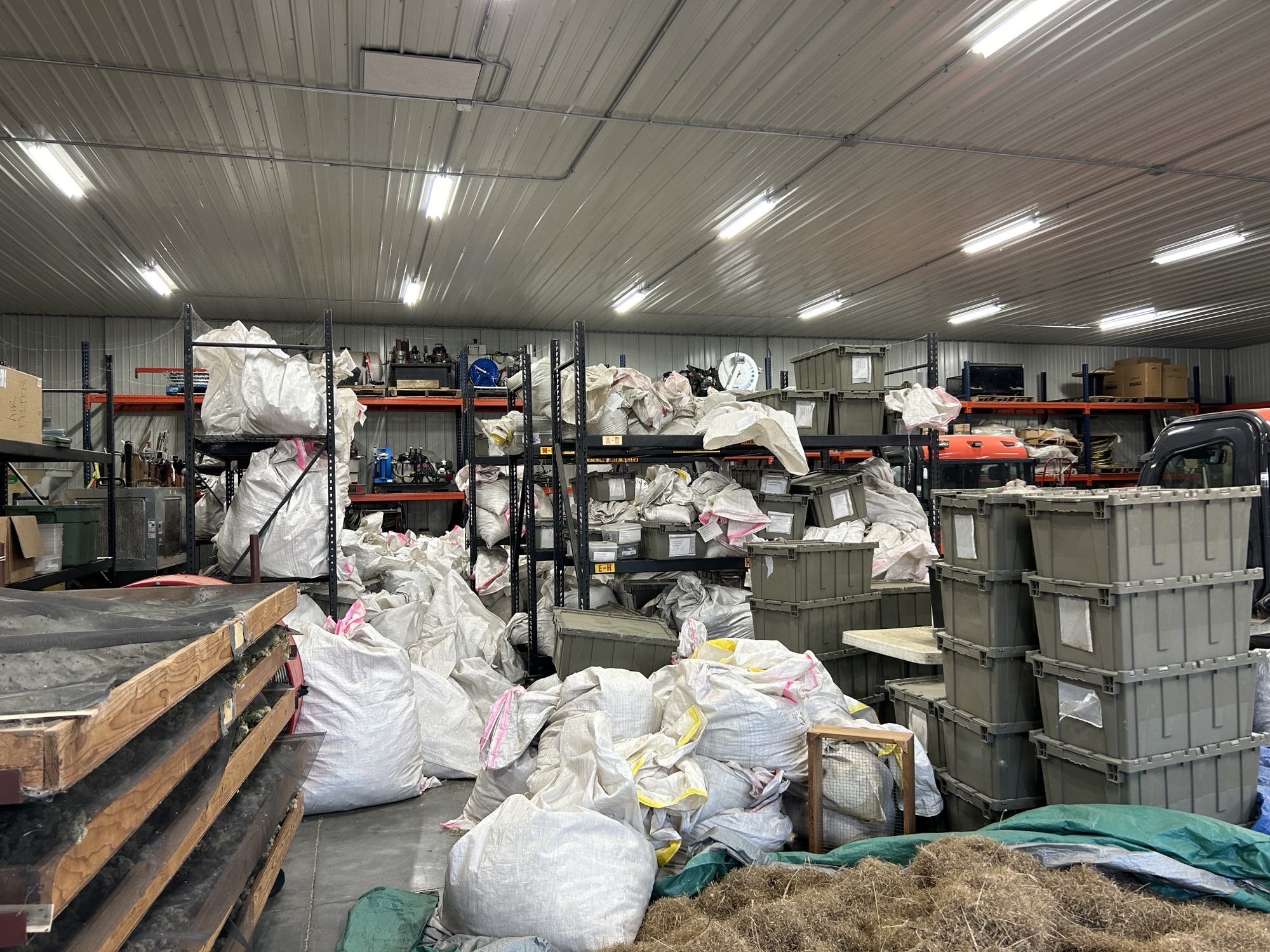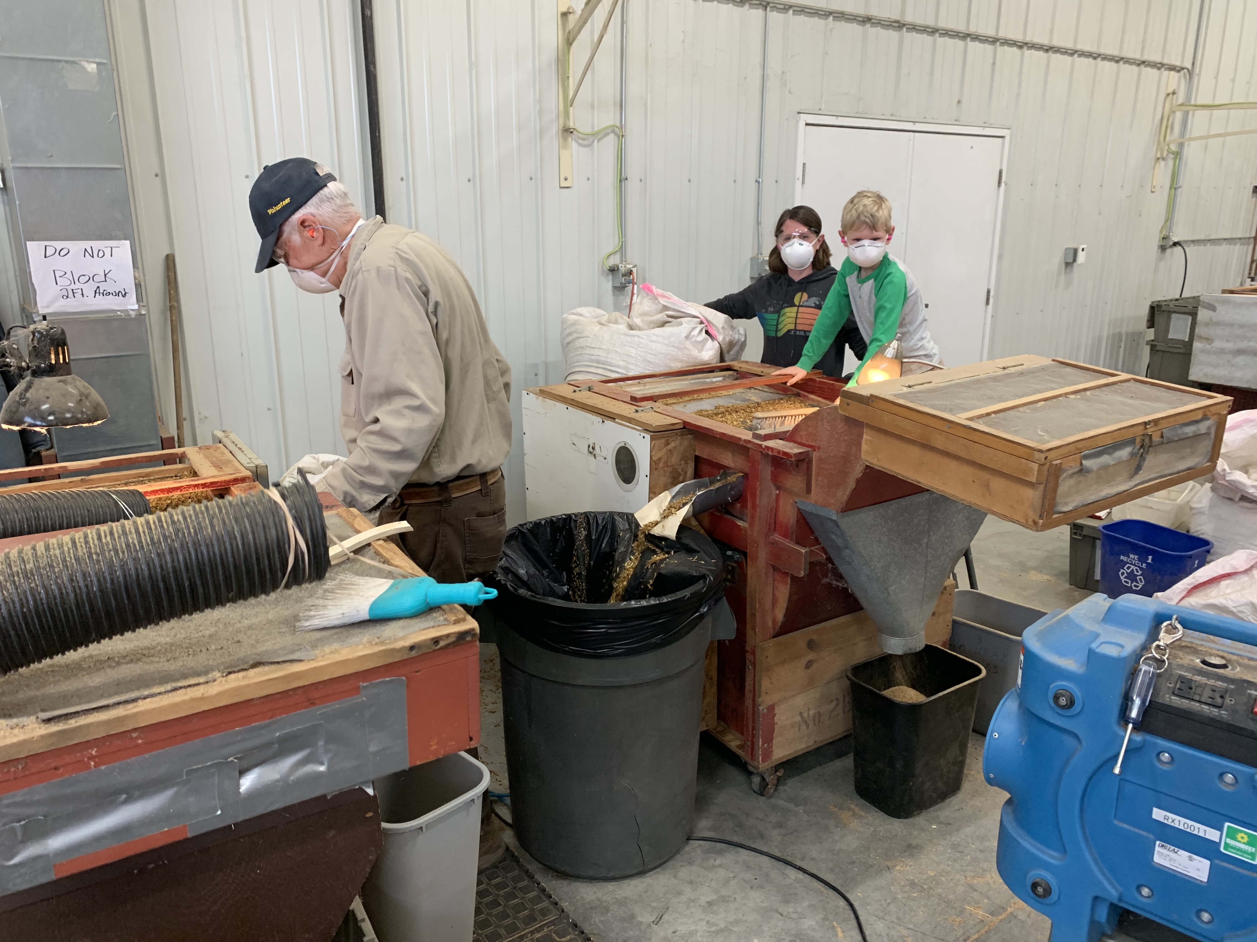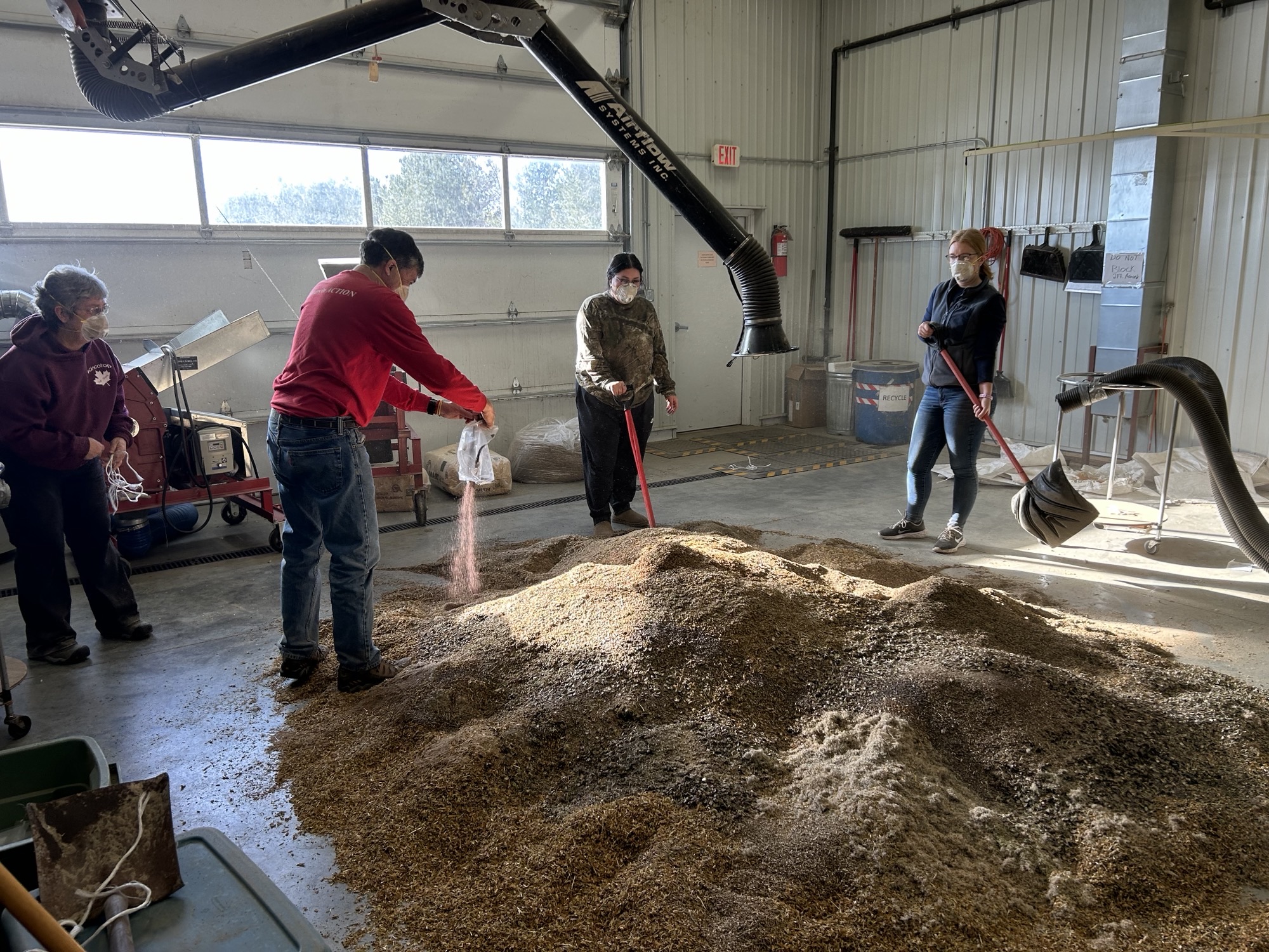 Seed processing (cleaning) – Each day, after the seed has been collected, it is laid out in kiddy pools on racks to dry under fans. Once the seed is dry, we process (or clean) it. This is all done in our seed shed where we run the seed through hammer mills to break up the stems and release the seed from the vegetative plant parts. We then run the seed through fanning mills which act as a sort of sieve with a fan to separate “the wheat from the chaff” leaving us with (nearly) pure seed. Often these processes are each repeated multiple times before moving on. In this, too, our volunteers work right alongside our staff. From the end of October through mid-November we had seed cleaning workdays every day of the week. We typically run two a day, one in the morning and one in the afternoon. In total, we had 36 seed cleaning workdays last fall. Our seed shed (two bays of a pole barn) can have two hammer mills and 6 fanning mills going at once.