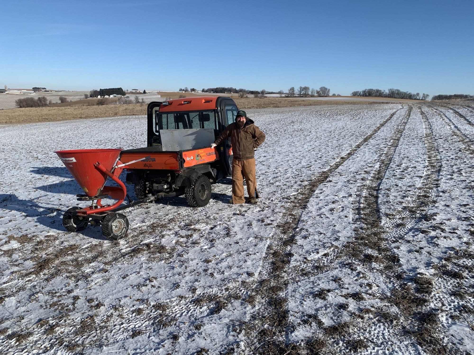 Seed spreading in winter – Our staff spreads the largest mixes, typically the new prairie plantings, with pendulum seeders pulled behind UTVs or tractors. We prefer to do this on top of snow, so that our tracks and seed can easily be seen, allowing for an even coat. Small plantings or over-seeding areas are often planted by hand. This can also be done with rare species that need to be planted in highly specific areas. How do we hand-plant dozens of seed mixes? You guessed it, volunteers! Many parks have volunteer Friends groups or Certified Land Stewards (volunteers with training to work independently) who may be responsible for spreading their own seed mixes once they pick them up from staff. We also have several volunteer workdays where staff lead volunteers in hand planting. All of this gets completed in time for burn season! Before we know it, we will be starting to collect next year’s seed.