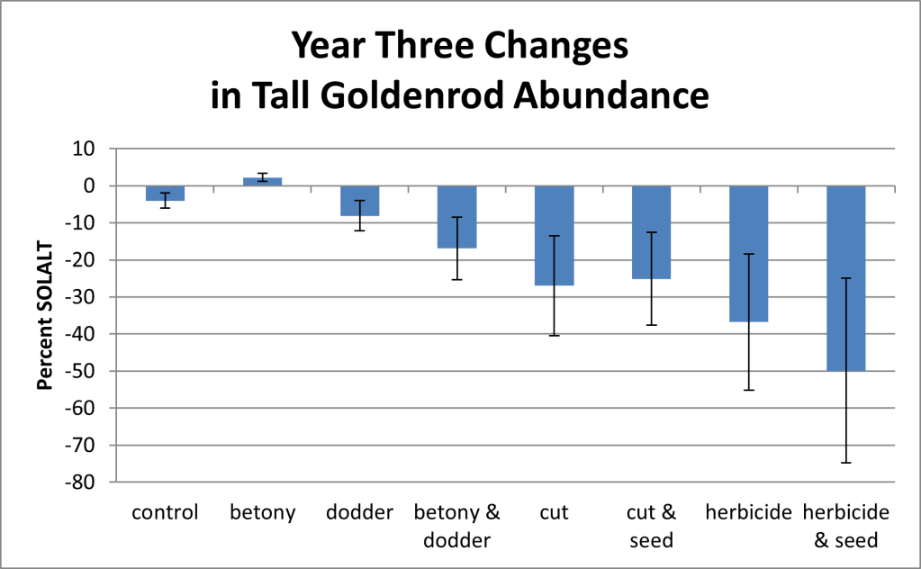 Following up on your last paragraph, we’ve similarly found that we have less and less goldenrod to spray each year in the herbicided plots, so the suppression is lasting for at least a little while. We’re considering whether to stop doing the treatments at some point and just continue monitoring, to see how long any effects last, in case a steward wanted to turn their attention elsewhere. It would be nice if, eventually, strong competition was the primary means of goldenrod control!