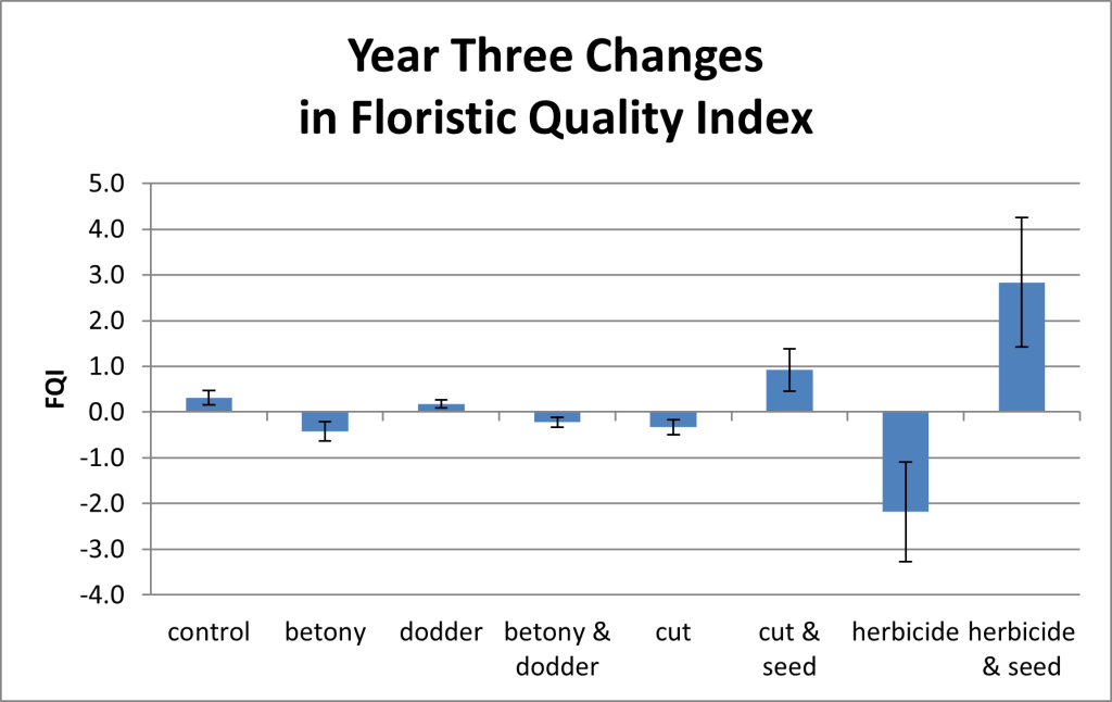 The main takeaway thus far seems to be that selective control plus supplemental seeding is the most effective strategy.  If one wanted to avoid the drop in FQI with the herbicide-only treatment, which presumably is due to underground collatoral damage, one could try selectively cutting rather than selectively herbiciding, as some stewards do (typically using scythes).