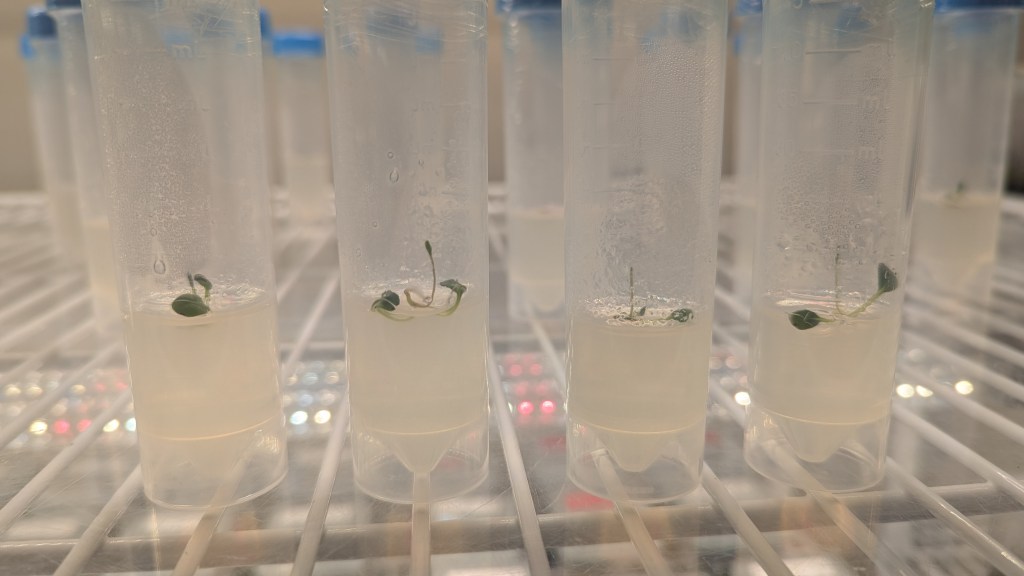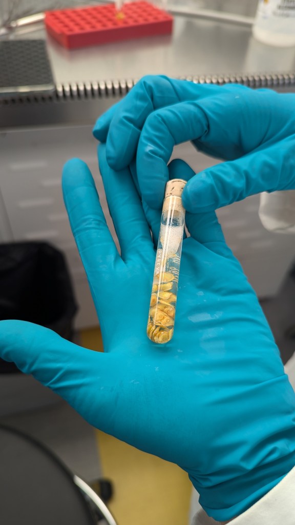 We soon transferred the embryos to new media, and gave half some hormones to stimulate root and shoot production as some seemed to be having difficulty getting started. Fun fact, the hormone is actually the herbicide 2,4-D, just in miniscule amounts instead of the larger dose that forces plants to grow too fast to sustain.