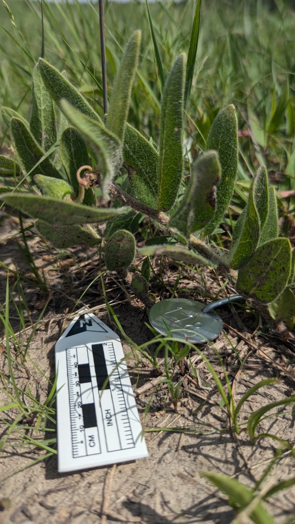 We chose to begin conservation work on the woolly milkweed as it’s considered globally vulnerable (G3, NatureServe 2025), little is known about it in Nebraska, and Asclepias species are charismatic thanks to their association with monarchs. There is a little overlap between the earliest spring migrating monarchs and Nebraska woolly milkweed blooms. It’s also possible that monarchs lay eggs on plants that have already bloomed, but we don’t know yet. If anyone has insight on this, please reach out!