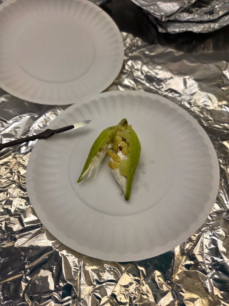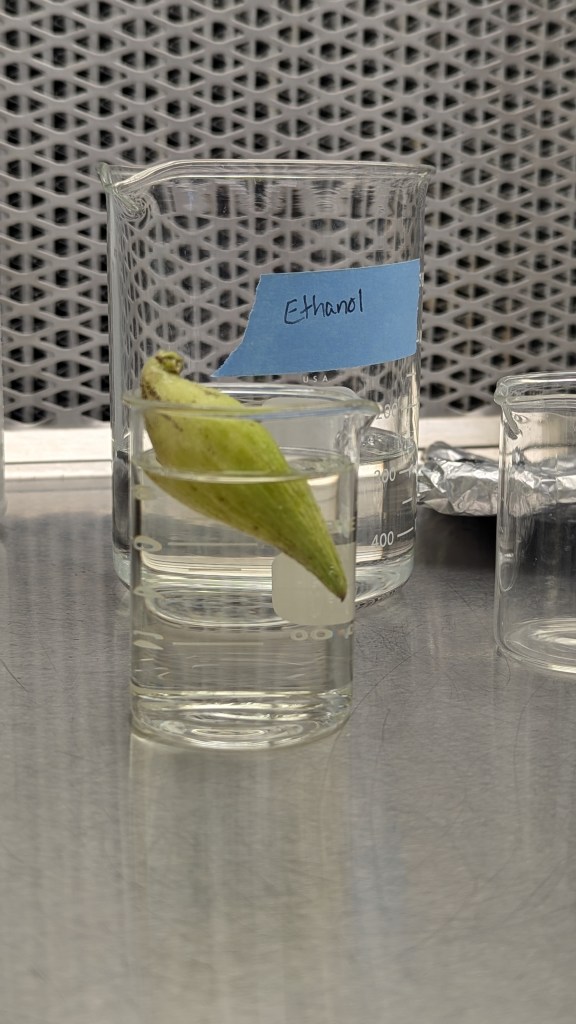 The one seed pod from plant #118 was harvested in the second week of July and brought back to Lauritzen for an embryo rescue attempt. No seeds from a pod produced by this population a few years ago germinated via typical Asclepias propagation procedures, but that doesn’t necessarily mean they are completely inviable. Sometimes the embryos are capable of growth but are not vigorous enough to break the seed coat. Removing the embryos and placing them into a sterile (in vitro) environment on a nutrient-rich growing media has yielded higher germination and growth rates in other milkweed species, so we decided to try it. One paper also found harvesting the seeds earlier than normal (before the pod splits) improved germination with the embryo rescue method.