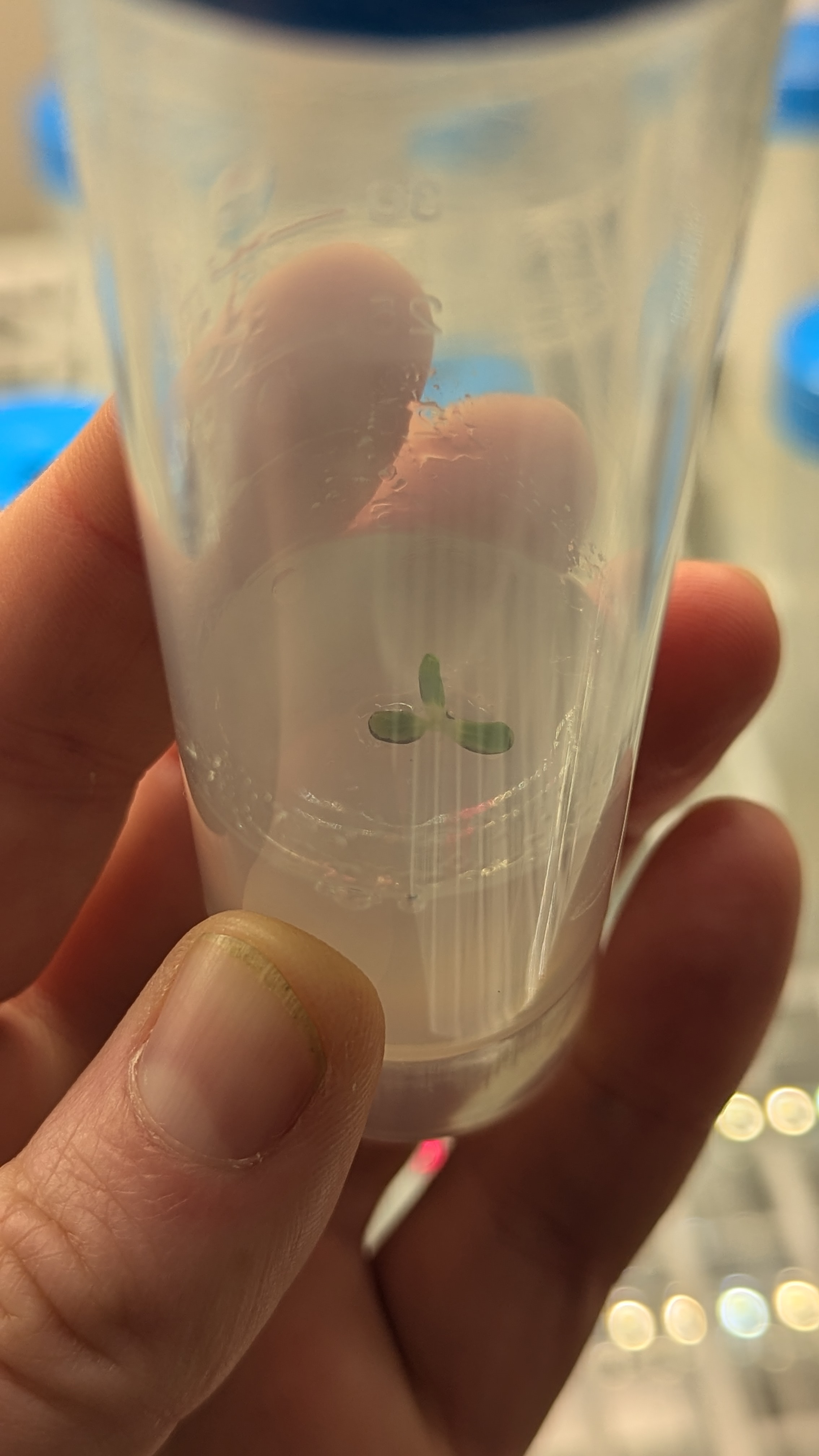 We soon transferred the embryos to new media, and gave half some hormones to stimulate root and shoot production as some seemed to be having difficulty getting started. Fun fact, the hormone is actually the herbicide 2,4-D, just in miniscule amounts instead of the larger dose that forces plants to grow too fast to sustain.