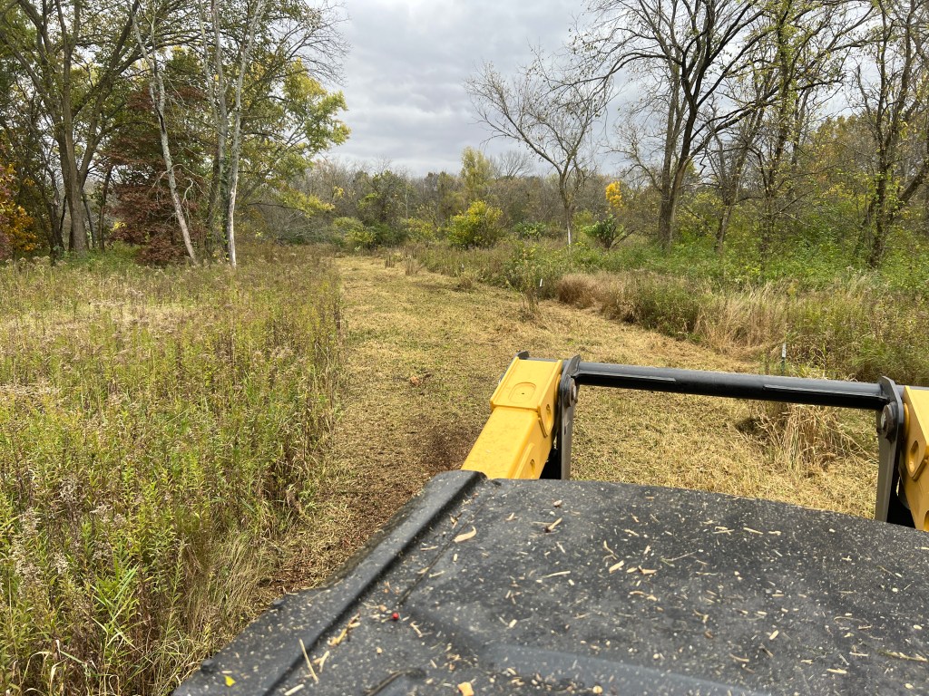 October 21: Big Jump West fire break preparation. The skid loader just mowed the fire break. All that vegetation is now mulched. Typically, we hay rake and then use a leaf blower powered by our tractor to move that mulch off the fire break.