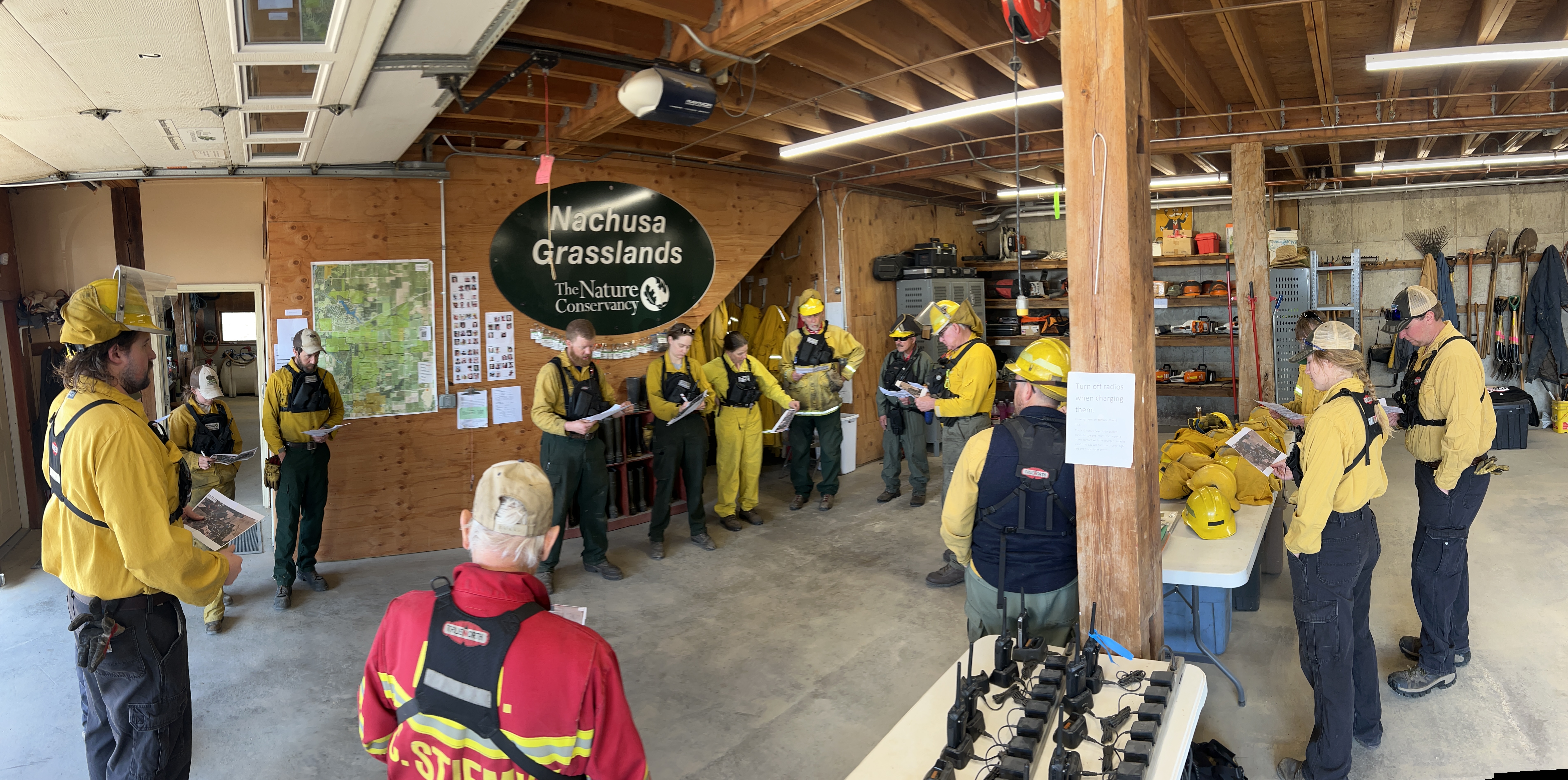 March 30: Kaleb Baker of INPC leads the fire safety briefing for a DNR fire at Franklin Creek State Natural Area. At the briefing each crew receives a map and a crew roster which tells them which team they will be on & what equipment they will have. The map and roster are printed and on the radio table when crew arrive, and they enjoy pondering the information gleamed from it. The briefing lasts about 20 minutes. Then each team gets together and figures out some last minute logistics, tests their equipment, then they leave to go inspect their fire line that they will control for the day.