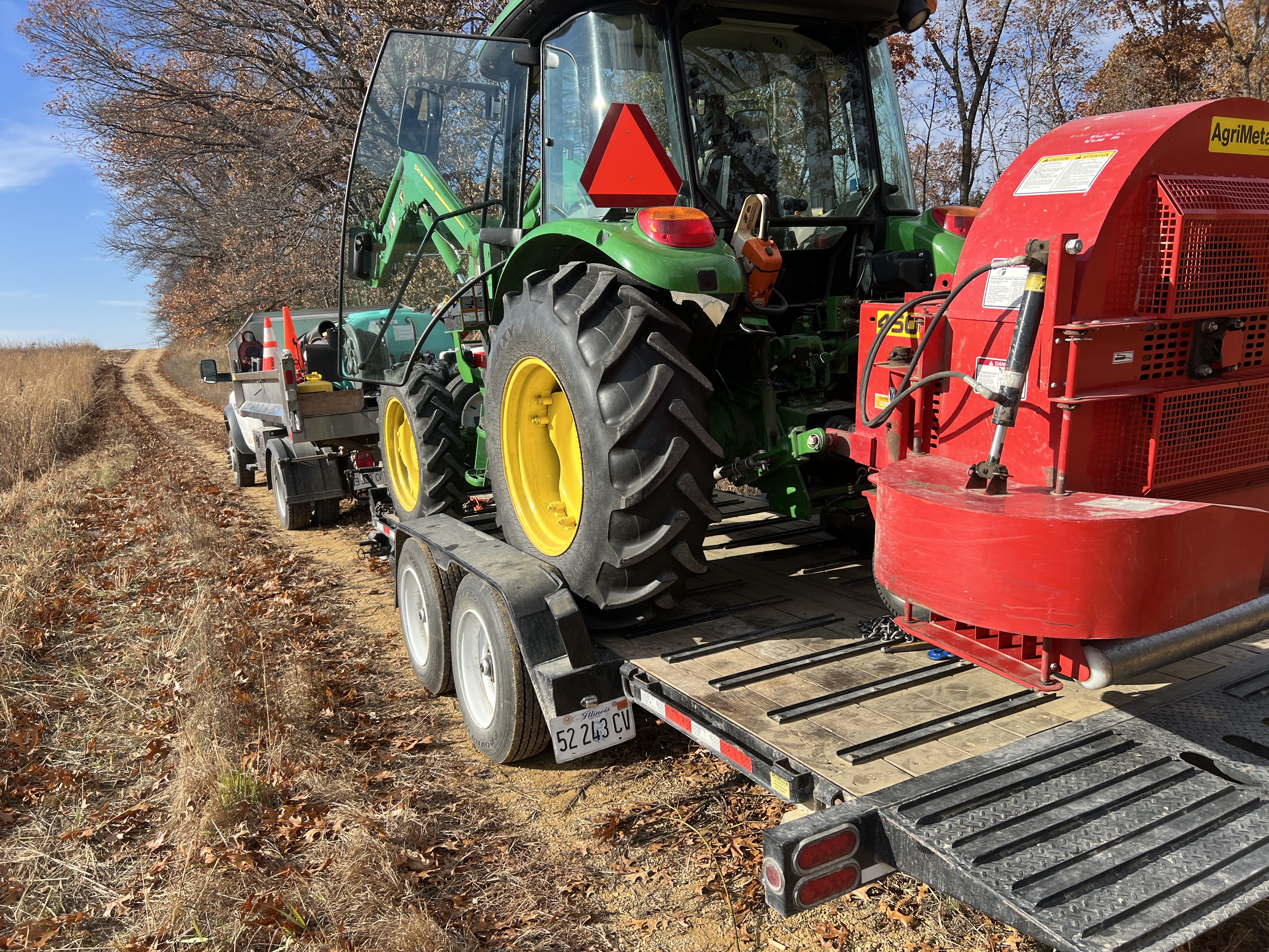 November 11: Preparing fire breaks. The tender truck towed the tractor to this unit and then that red leaf blower cleared about two miles of leaves and mowed vegetation from the fire break.