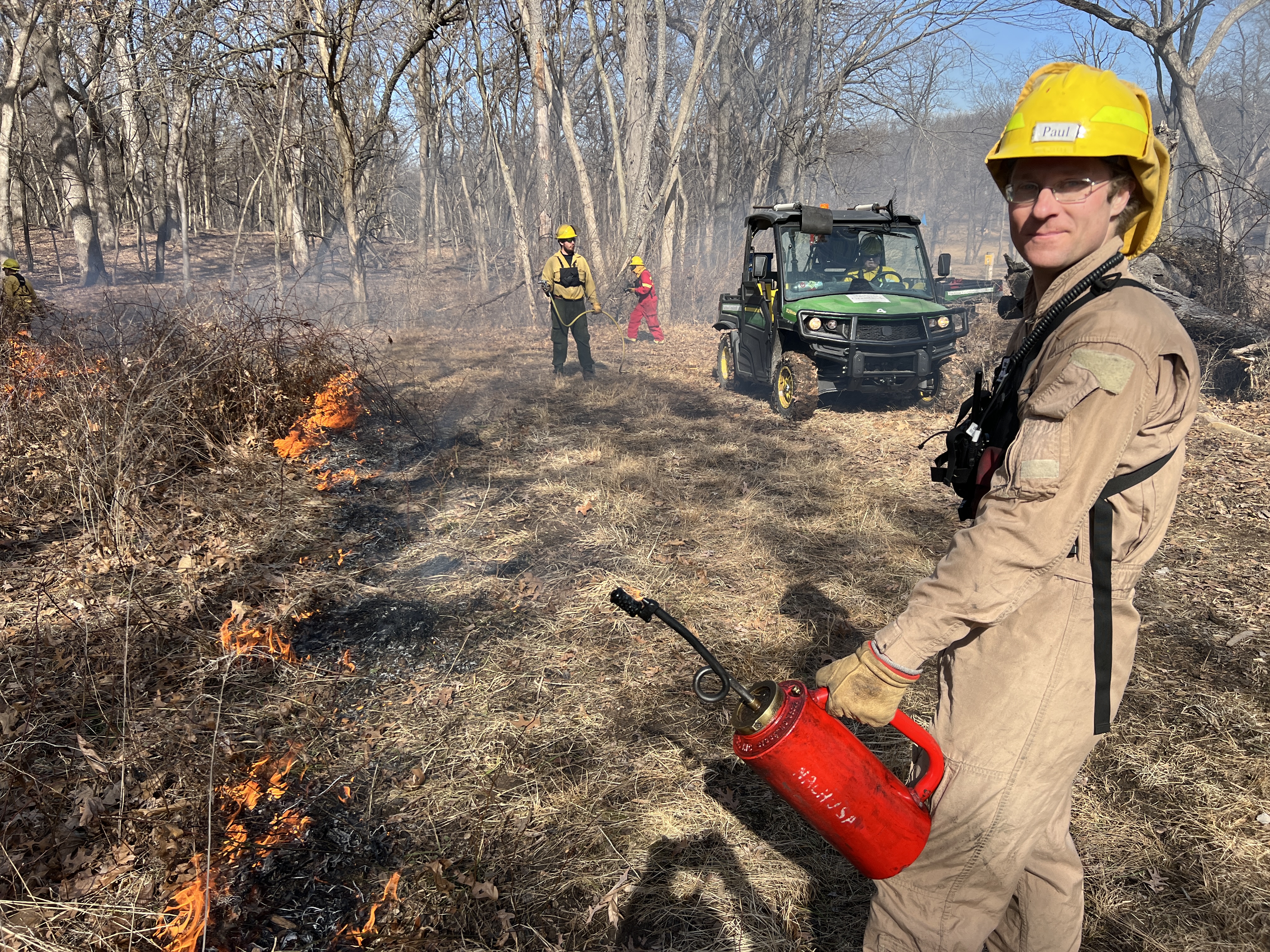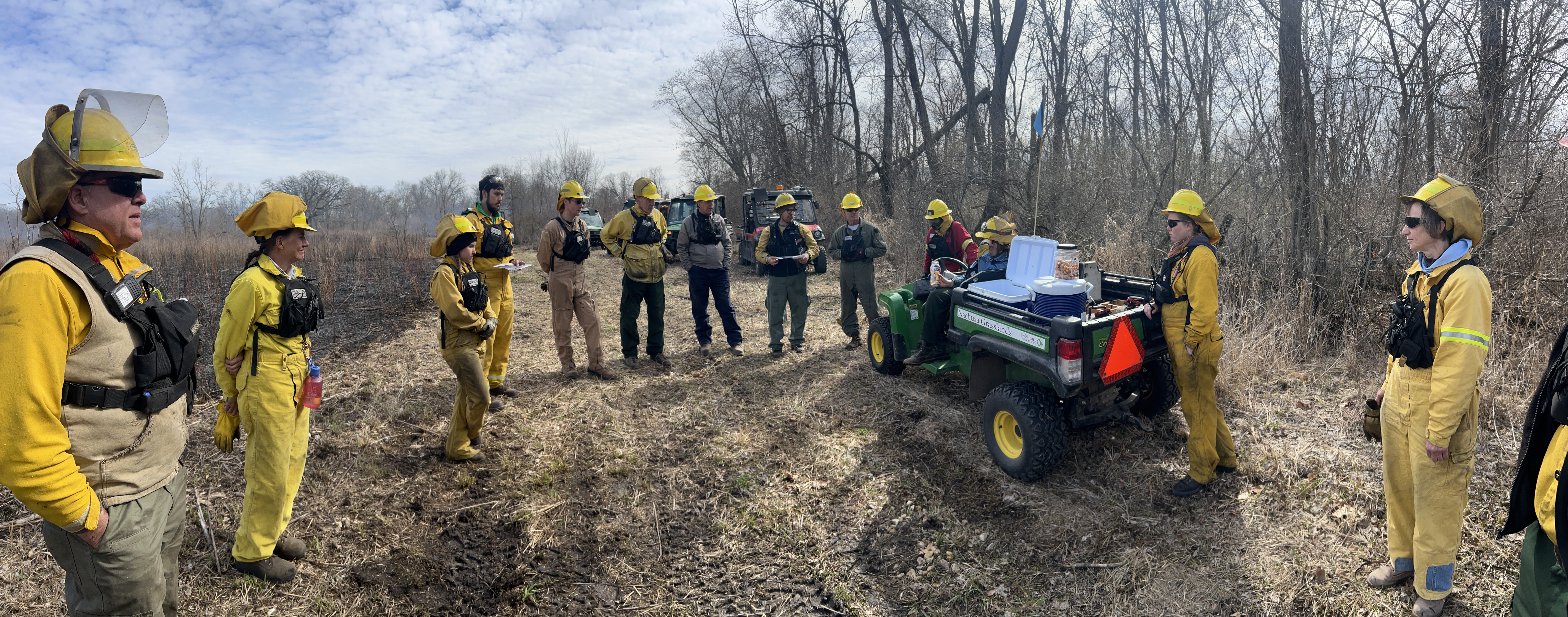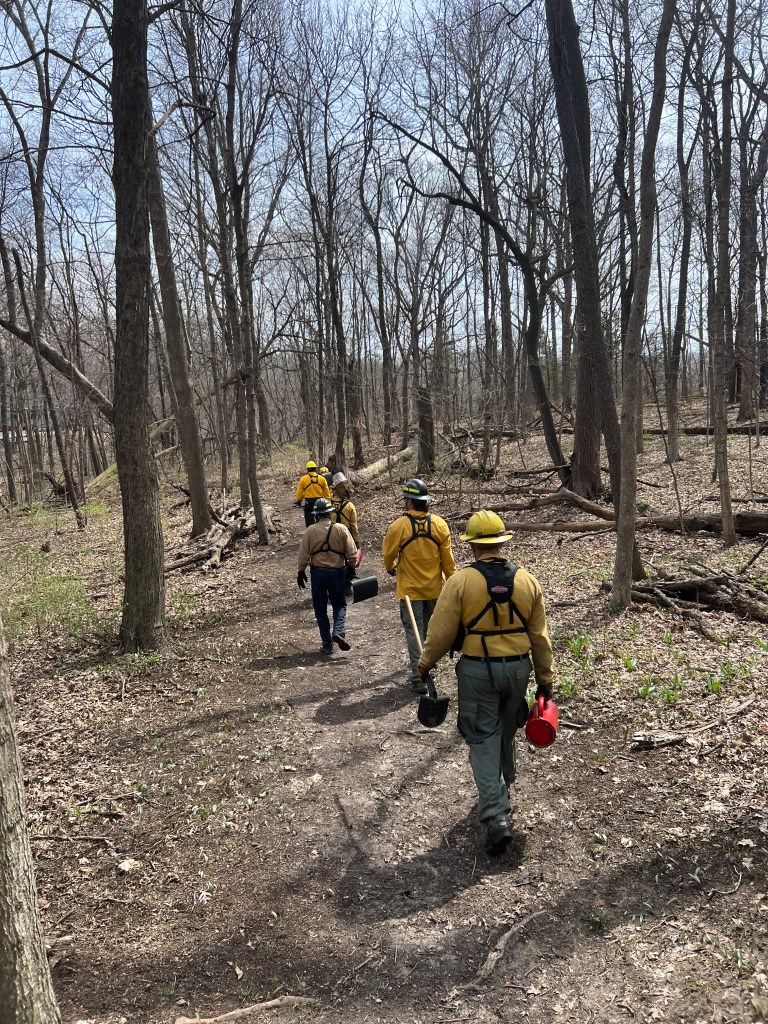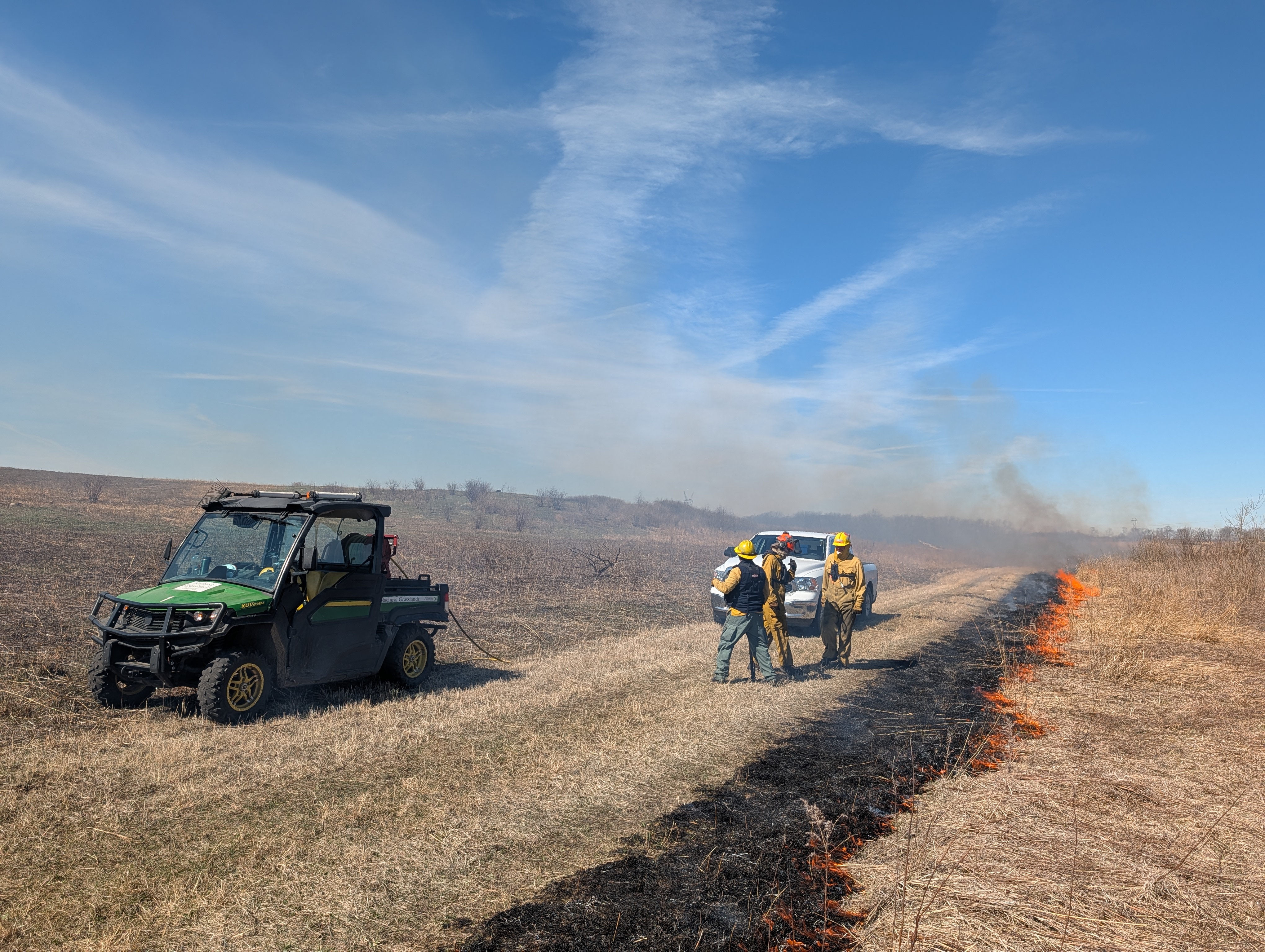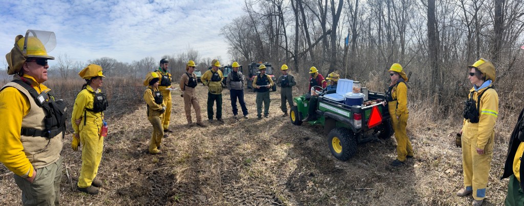 March 28, Stone Barn Savanna burn, 300-acres. Crew is gathered for the After Action Review to discuss lessons learned. The UTV there is our fire scout vehicle, which carries snacks, drinking water, and torch fuel. Four of these crew are staff, the rest are ‘civilians’. Go team!