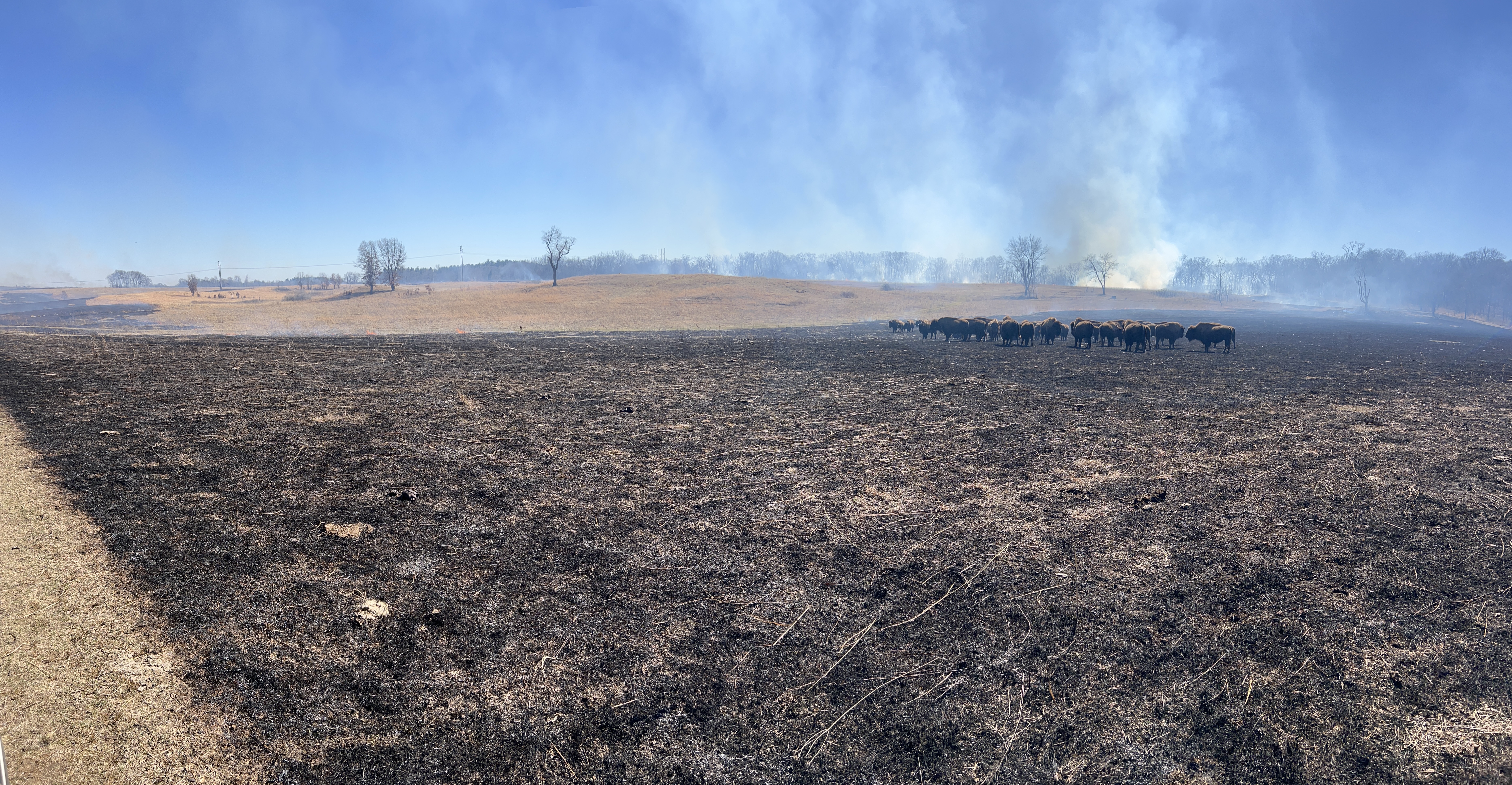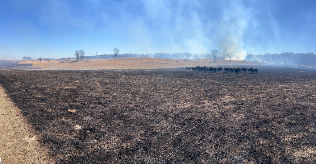 March 9: Hook Larson Unit, 114-acres. Bison are typically very calm when we burn. This bunch was in the burn unit. We slowly moved them out of the unit and kept burning. Bison seem to hover in grazed lawns where the fires hardly burn, and they will hang out in fresh black.