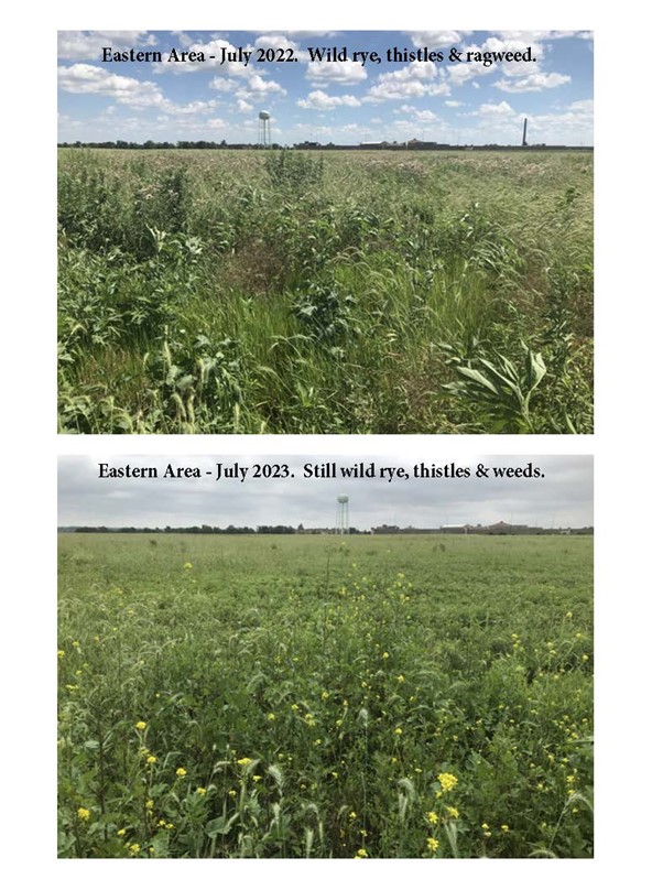 When I first started in 1993 there were two prairie plantings that were several years old and had come up in a lot of white sweet clover. We decided to mow it as low as we could after the Fourth of July. The above photo shows one of these prairie plantings with a very thick cover of white sweet clover. If we had chosen to spray this there would be no prairie planting remaining. So we mowed it.