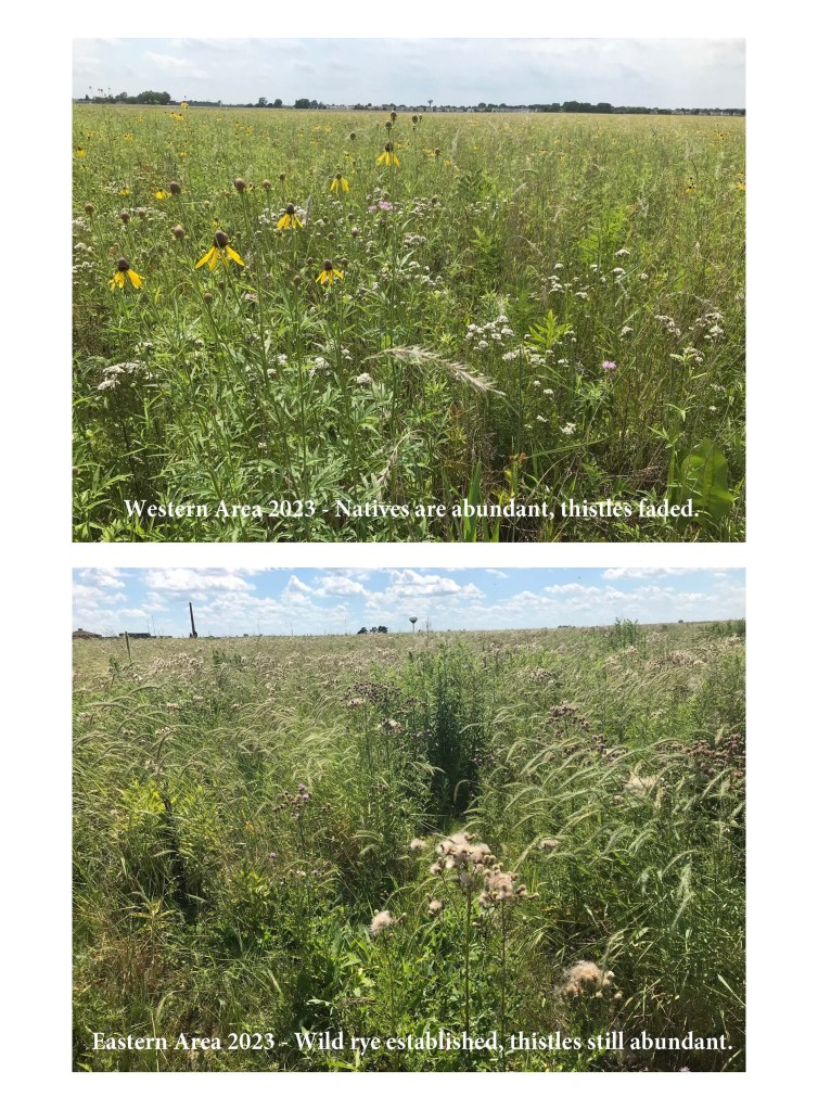 I’m starting to believe that the best approach is to spot mow the large patches while it is in full bloom and continue to overseed these areas with more prairie forbs. I don’t think this will necessarily get rid of the Sweet Clover but will continue to add competition and make it more palatable to spray or hand pull the stragglers.